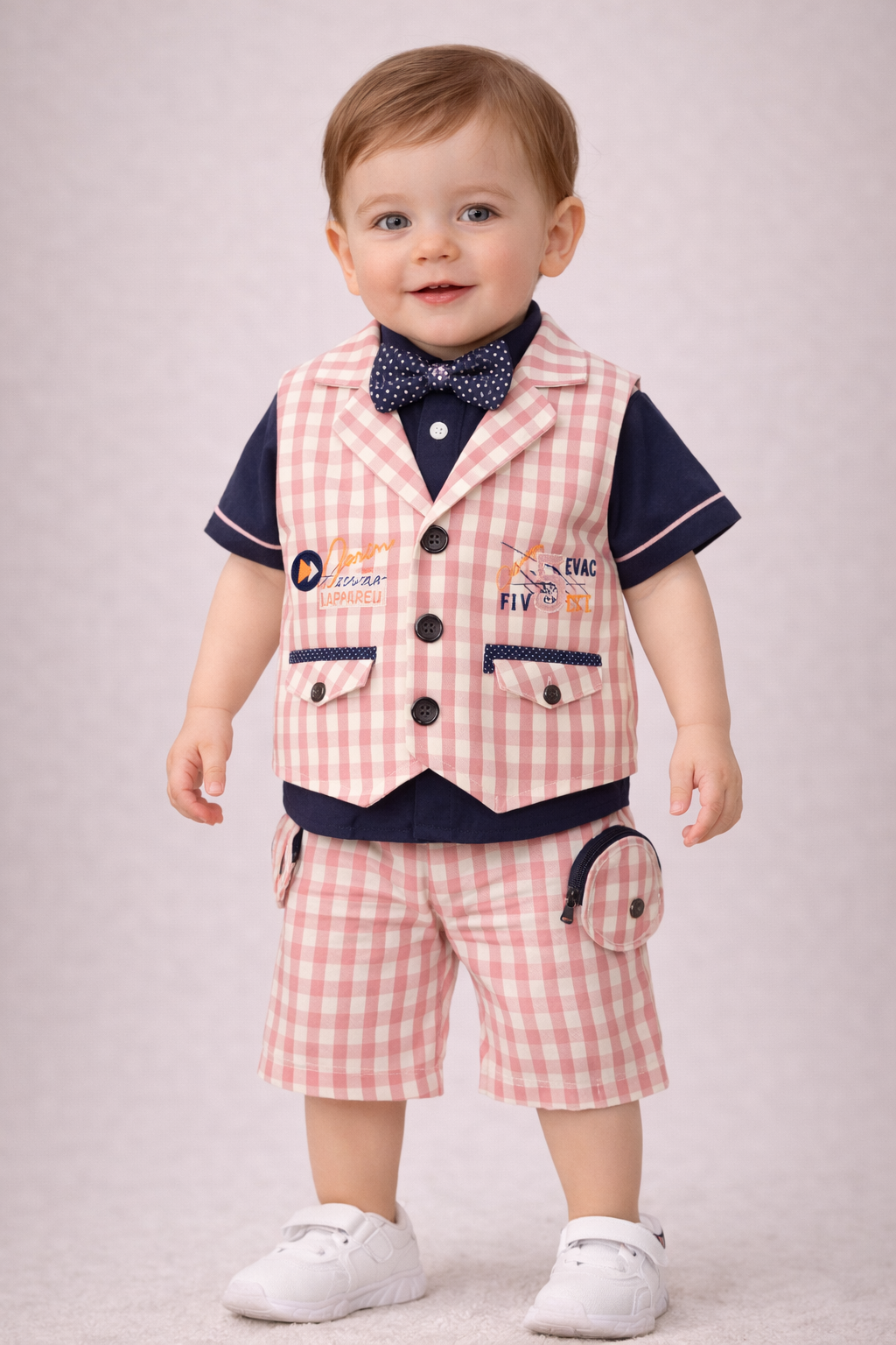 - اسٹائلش ڈیزائن: گلابی اور سفید چیکرڈ پیٹرن کے ساتھ نیوی بلیو شرٹ اور بو ٹائی (bow tie) ایک دلکش اور فیشن ایبل لُک دیتی ہے۔