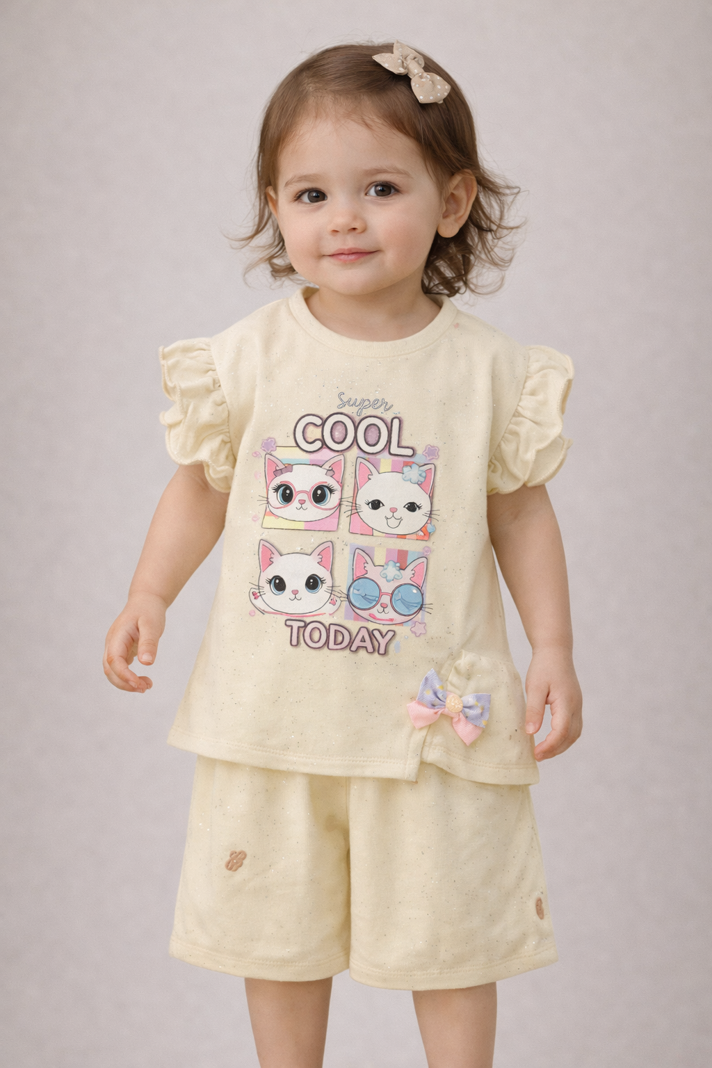 • پیارا ڈیزائن: شرٹ پر ایک دلکش “Super Cool Today” کیٹ گرافک پرنٹ اور شارٹس پر نیلے دلوں کا پیٹرن اسے ایک منفرد اور پرکشش شکل دیتا ہے۔