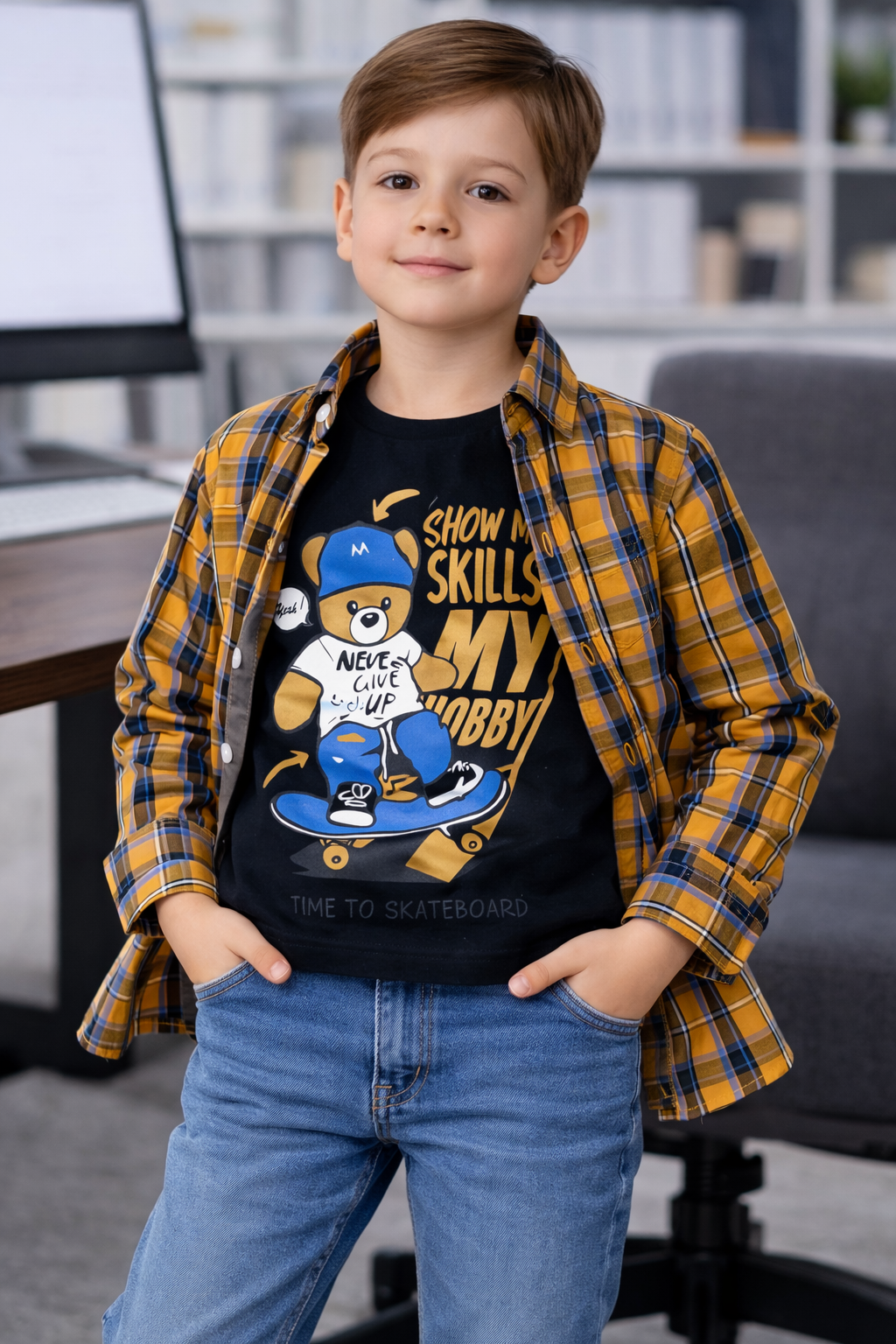 The classic check pattern and neat stitching give it a stylish yet professional appearance, ideal for casual outings, family gatherings, school events, or everyday wear. The lightweight fabric ensures easy movement and keeps your child comfortable in every season.